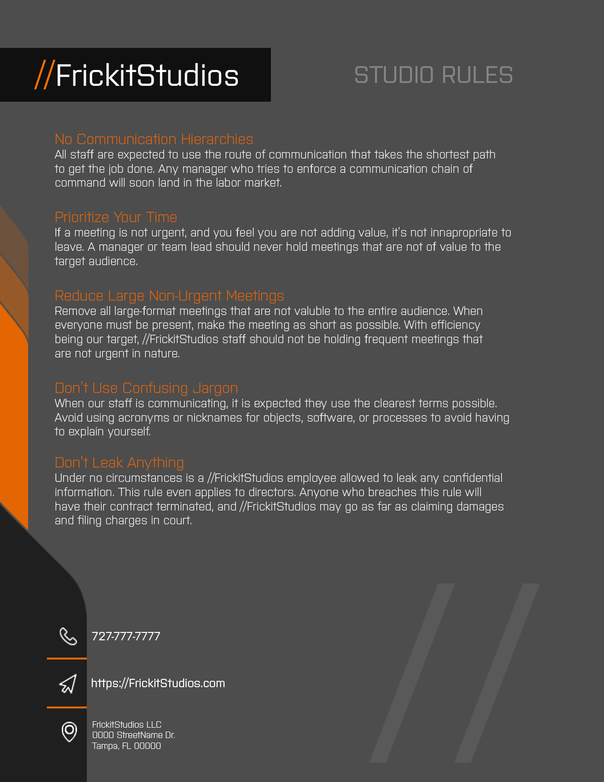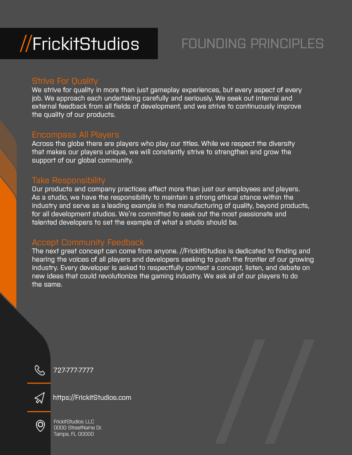 Oversees all aspects of //FrickitStudios and the creative development processes. The Studio Director handles all administrative developments and issues as well as overseeing the Producer and Project Managers.